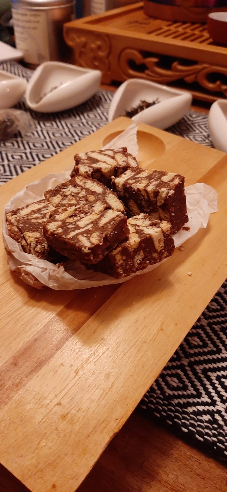 De arretjescake heb ik gekoppeld aan een lichte oolong, de China Tie Guan Yin van Simon Levelt. Deze bloemrijke thee zorgt is een mooie match met de chocola. Zoek je iets toegankelijkers, kies dan voor een muntthee of een goede fruitthee.